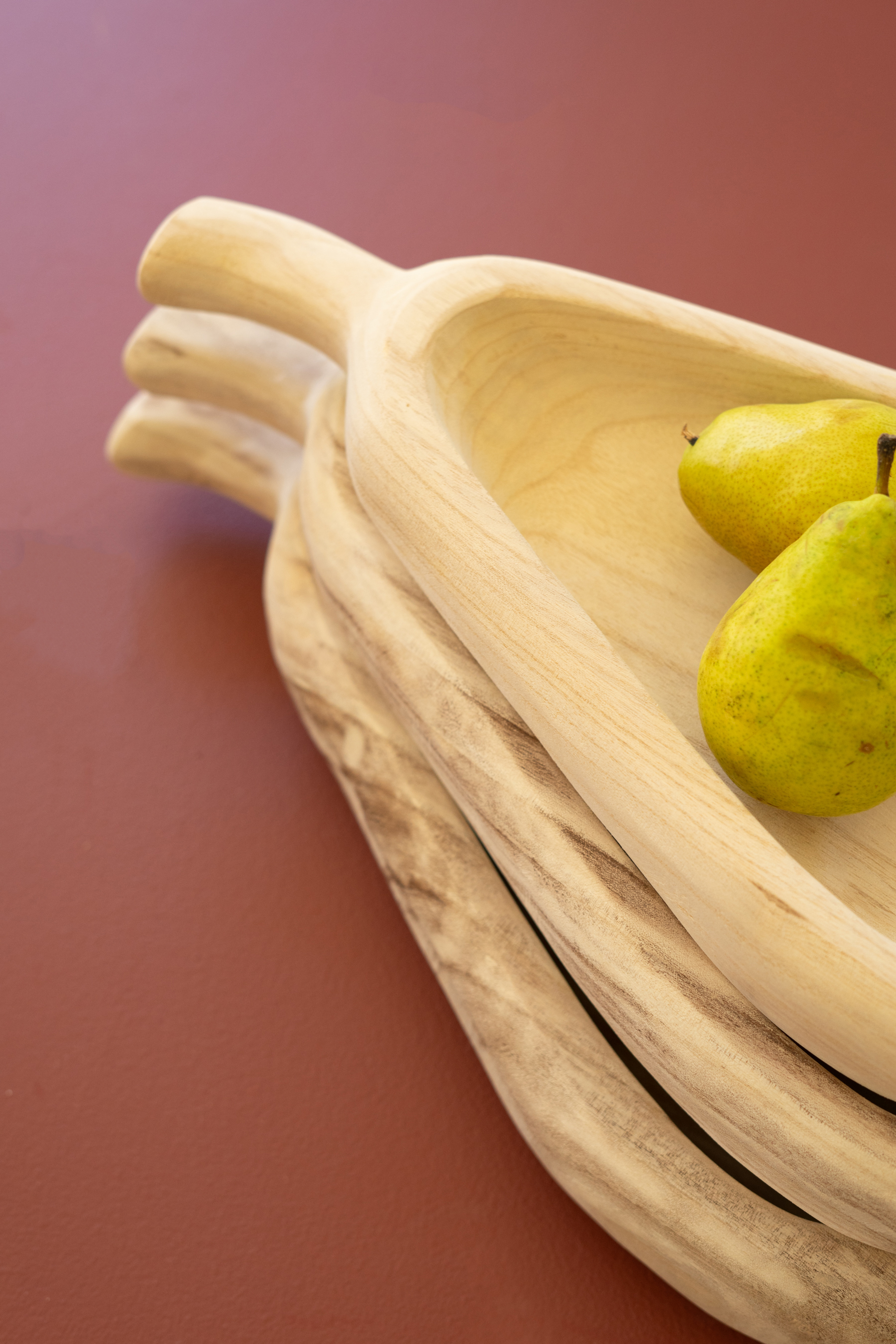SET OF THREE PEAR-SHAPED CARVED WOOD BOWLS SET OF THREE PEAR-SHAPED CARVED WOOD BOWLS SET OF THREE PEAR-SHAPED CARVED WOOD BOWLS