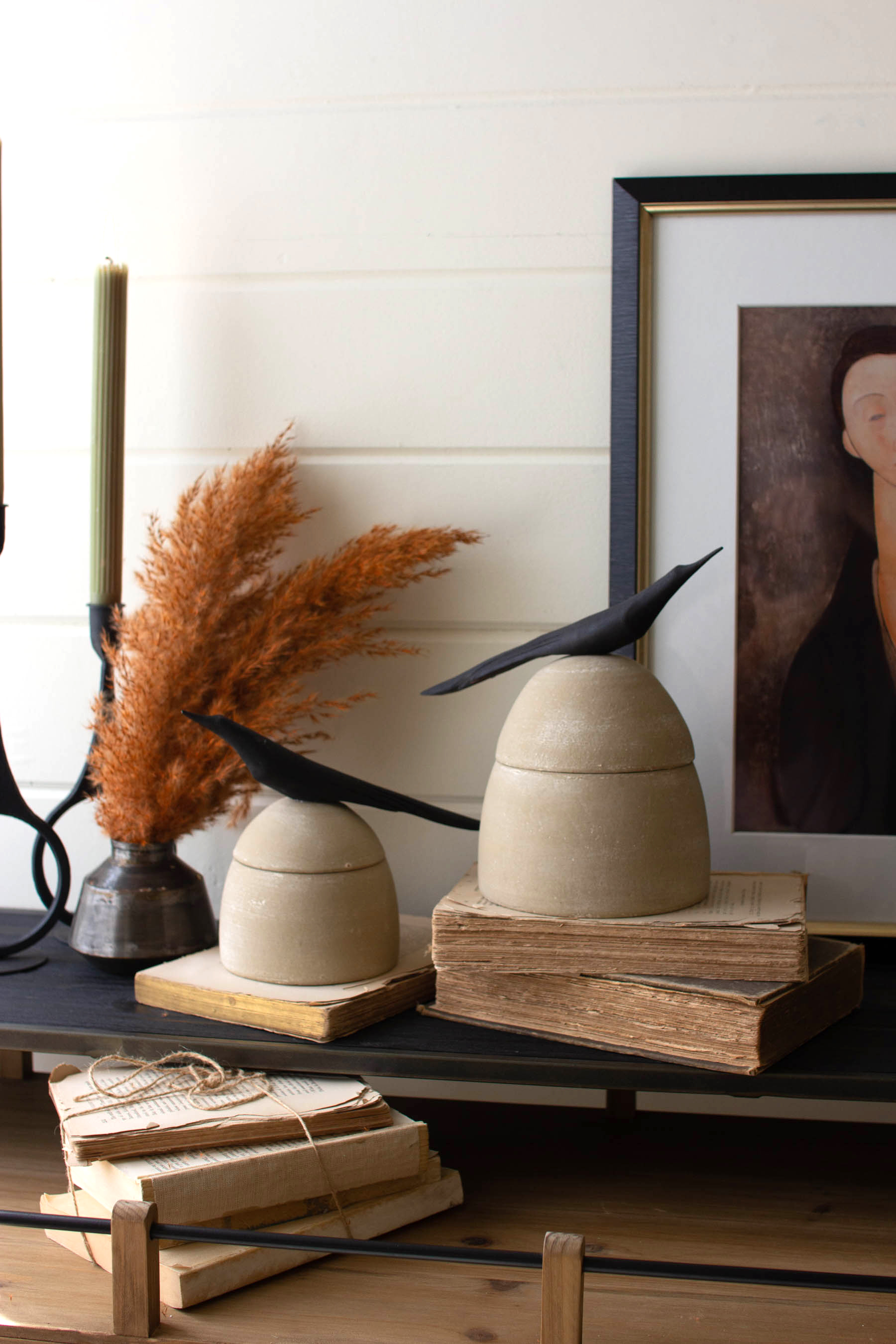 Home > SET OF TWO CLAY CANISTERS WITH WOODEN BIRD HANDLES