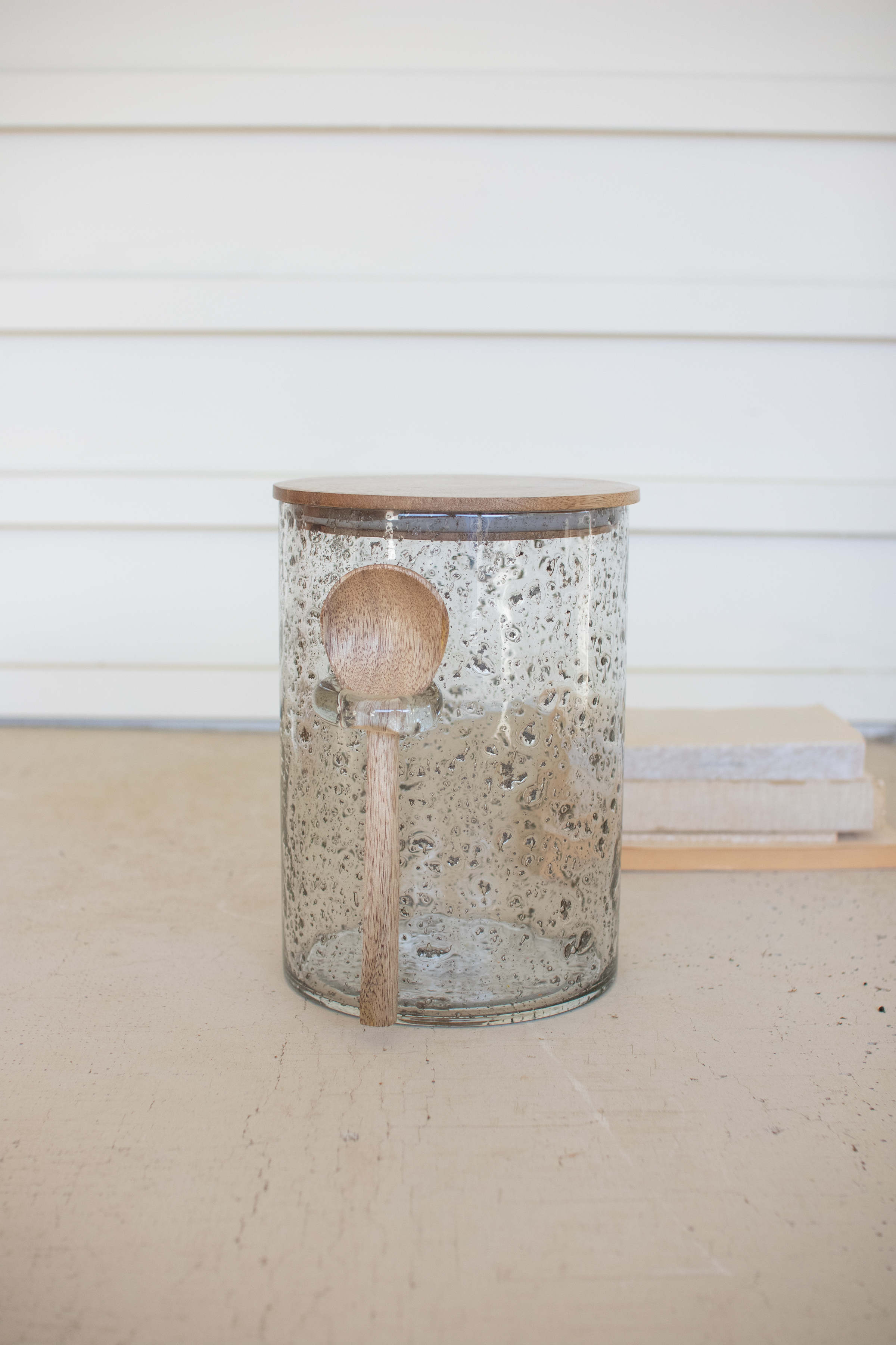 GLASS CANISTER WITH WOOD TOP AND SPOON - 10" TALL