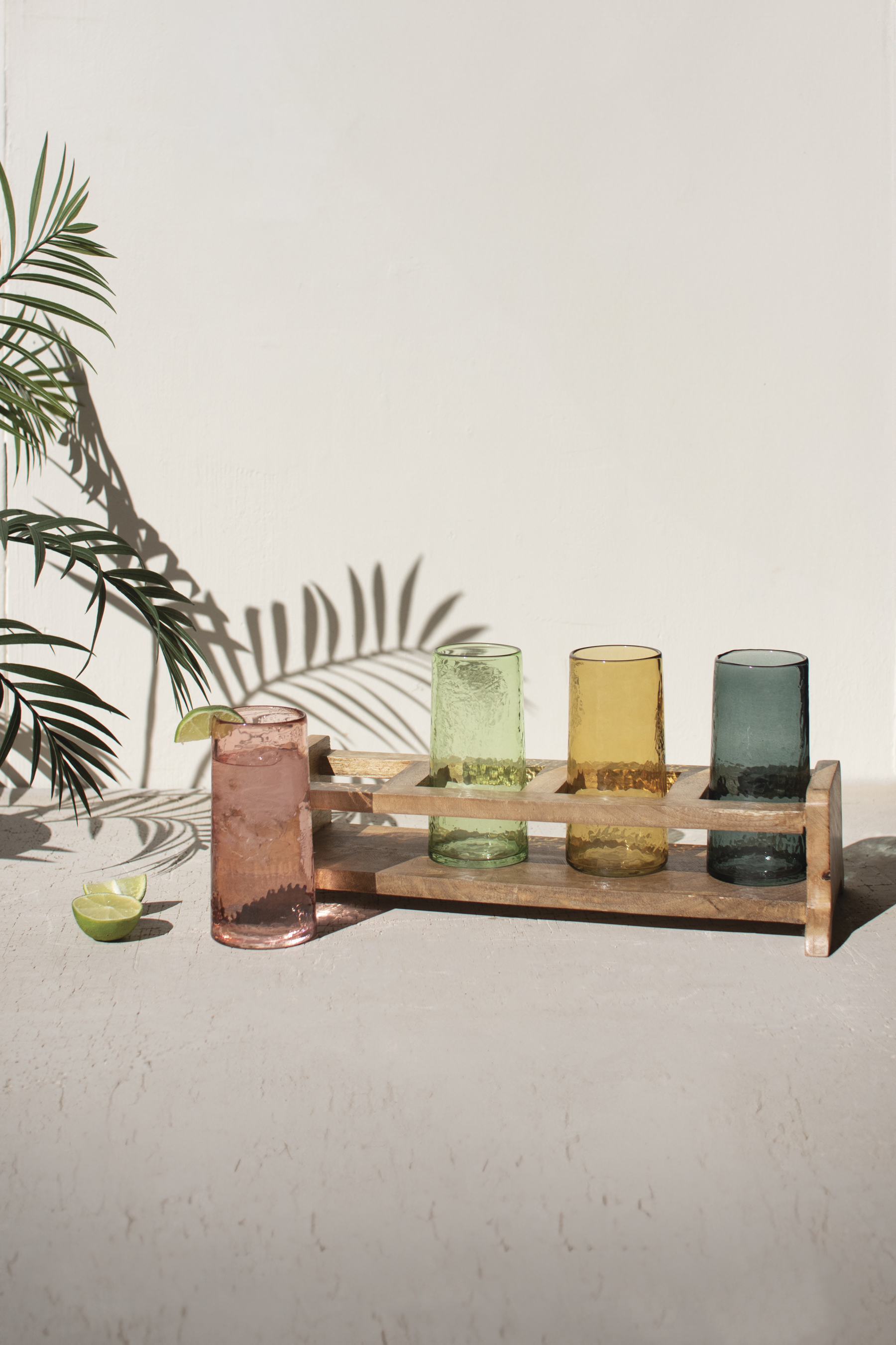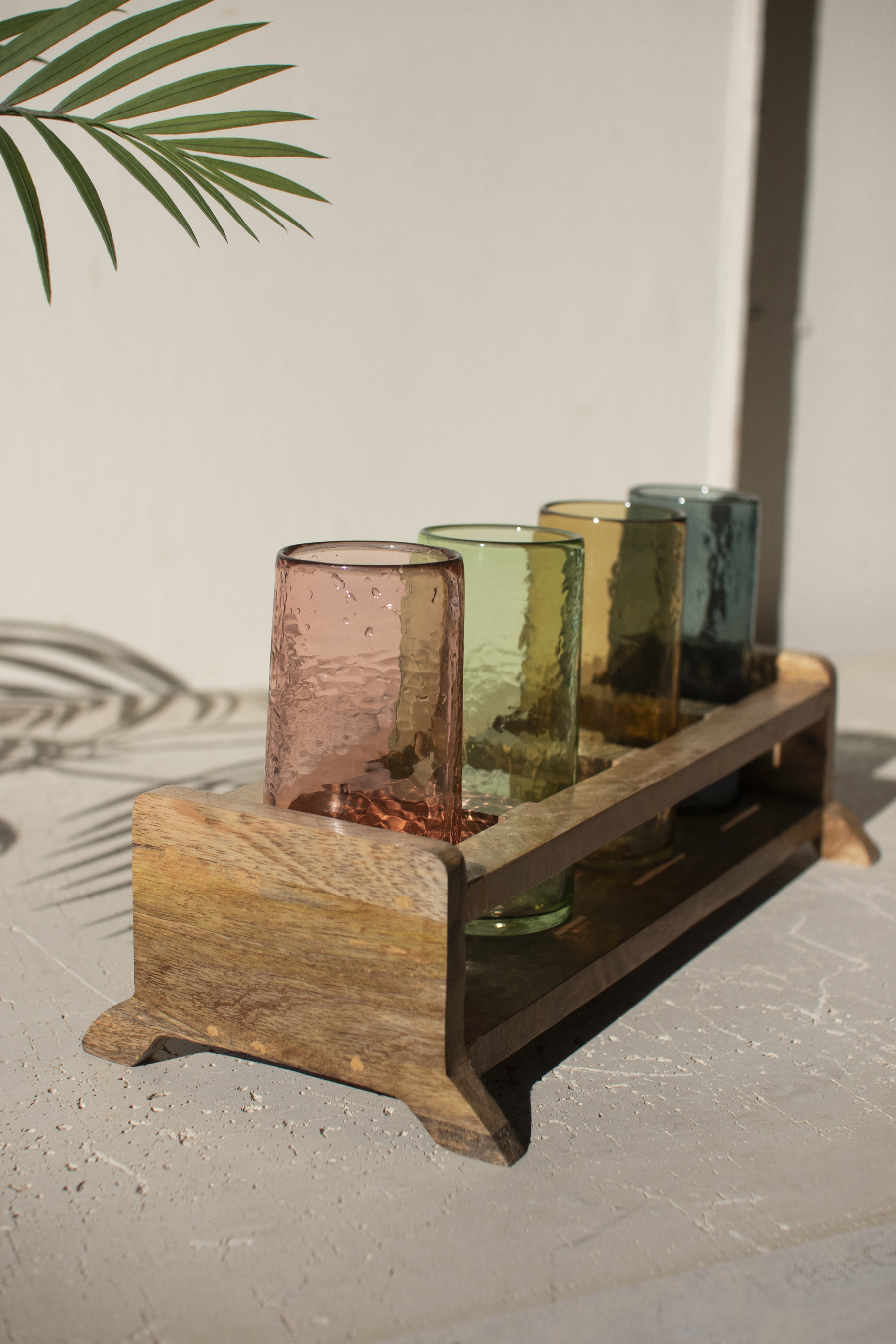 FOUR COCKTAIL GLASSES WITH WOODEN TRAY - ONE EACH COLOR