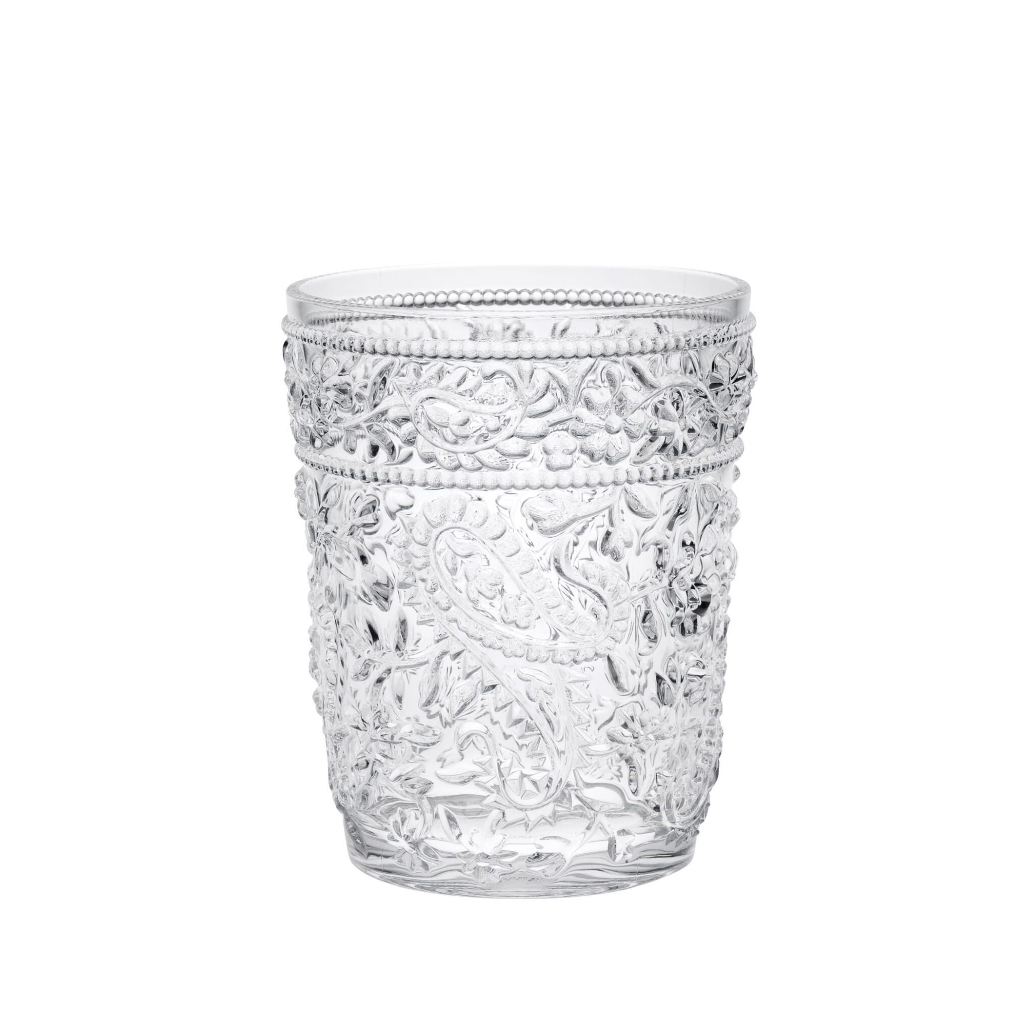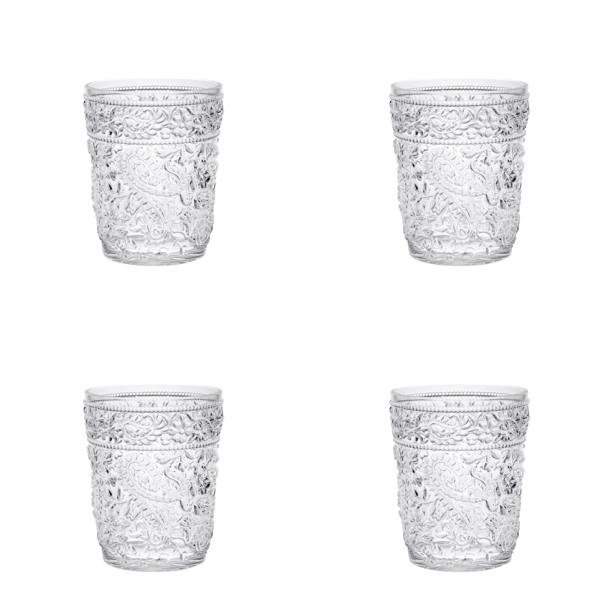 The set of four clear paisley acrylic stemless whiskey glass is a good-looking glass to use for your favorite whiskey but can also be used for most any other drink or beverage. Elevate any occasion with a set of stunning stemware that is as functional as it is beautiful. Whether you prefer a simple or complex flavor profile, stemless glasses offer the perfect vessel to savor every sip. Beautifully machine embossed to give your glassware a bit of design, character, and dimension. Bring a pop of personality to your kitchen or dining room with this paisley pattern. The textured surface gives this a unique and dimensional feel. Whatever your beverage preference, you are certain to enjoy the enhanced flavor and taste that comes with consuming from the proper vessel. 4.25-inch H x 3.38-inch W x 3.38-inch D